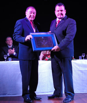 Pedro César Galassi, entregando homenagem a Eduardo Medina Bucker, que representou seu pai Alpheu Bucker (in memoriam)