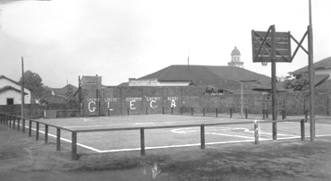 Foto dos anos 30 ou 40, de uma quadra de esportes que era instalada na rua Dionísio Barbosa Sandoval, em frente onde hoje funciona a Luciana Pescados Peixes e Frutos do Mar. Na parede do fundo, estava escrito “GLECA- Grêmio Literário Esportivo Castro Alves”, que funcionava como um diretório academico, da escola Antonio Justino Falleiros