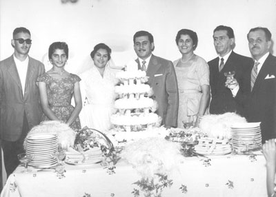 Foto de 22 de janeiro de 1957, do casamento civil realizado em São Paulo, dos professores Alexandre Miguel (“Bueno”) e Inah Ribeiro Miguel. (1) Sérgio de Oliveira Santos, irmão da noiva, (2) Cida Jorge Menezes, sobrinha do noivo, (3) e (4) os noivos Alexandre Miguel (“Bueno”) e Inah Ribeiro Miguel, os irmãos do noivo (5) Saduna Moyses Jorge e