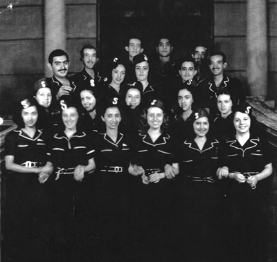 Bloco dos Solteiros, no carnaval de 1942 na Associação Atlética Ituveravense: (1) Abrão Abdala, (2) João Flauzino Sandoval Júnior, (3) Assad Chaibub, (4) Jorge Nunes, (5) Geraldo Eurípedes de Menezes (Cobrinha), (6) Luzia Ribeiro, (7) Nicota Nunes, (8) Jorge Mey, (9) Lourival Jorge (Lulu), (10) Cecília Restivo, (11) Aurora Barion (Lola), (12) Amarília de Lima Mattar, (13) não identificada, (14) não identificada, (15) Olga Lanna, (16) Ana de Lima Gambi, (17) Suzana Lanna Contart, (18) Alicinha Amorim Sandoval, (19) Maria Mey, e (20) Neuza Stupelo Sandoval
