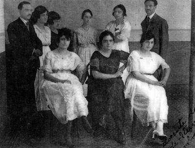 Corpo docente de 1920, do Grupo Escolar Fabiano Alves de Freitas. (1) Dorival Dias Minhoto, (2) Corina L. Minhoto, (3) Sílvia D’ Elia, (4) Rosa de Lima, (5) Jaci de Toledo, (6) Raphael Gonzales, (7) Iracema de Godói, (8) Elvira Gasparini e (9) Noêmia Marta Feijão