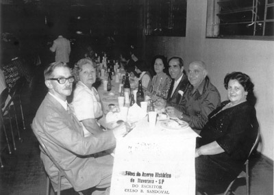 Foto dos anos 70, de um jantar festivo, no Salão de Festas da Sociedade São João da Escócia, dos amigos: (1) e (2) José de Paula Neto e Alzira Faria de Paula, (3) e (4) Miguel Jacob Daur e Nair Andrade Daur, (5) e (6) Elias Maud (“Lita”) e Josephina Amêndola Mauad (“Dona Pina”)