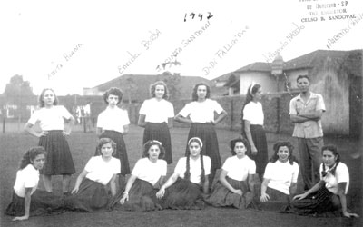 Foto de 1947, das alunas do Ginásio Municipal, e, aula de Educação Física na quadra da escola, que ficava próximo a Alpínia Fiat, (1) Anita Bianco, (2) Eneida Borba, (3) Jacinta Sandoval, (4) Placedina Falleiros Barbosa (“Didi”), (5) Aparecida Macedo, (6) o professor Aparecido Cavalcanti, (7) Lídia Lino, (8) Júlia, (9) Silia Abdalla, (10) Merí Germano, (11) Tida Jugdar, (12)Júlia Freitas, (13) Augusta Lino