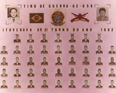 Formandos de 1983 do Tiro de Guerra. O instrutor chefe era o sargento Querino, e o presidente da instituição militar era o prefeito José Aureliano Coimbra