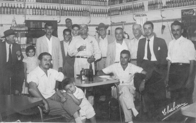 Foto dos anos 50, de uma reunião de amigos no Bar Tupi, que era instado à Avenida Dr. Soares de Oliveira, em frente ao Banco do Brasil, onde esta sendo erguido um prédio. O proprietário do bar era Paschoal Corona. (1) Augusto Barbosa Falleiros, (2) não identificado, (4) não identificado, (5) João Ferreira Telles, (6) não identificado, (7) Messias Barbosa Falleiros, (8) Cícero Barbosa Lima, (9) Marcionílio Trajano Borges, (10) Urias Luiz da Silva , (11) Walter Falleiros Telles, (12) José Franco Barbosa , (13), (14) e (3) Valter Matar, e os filhos Valter Nagib Matar Filho e Nida Bernadete Matar, (15) Jorge Mattar