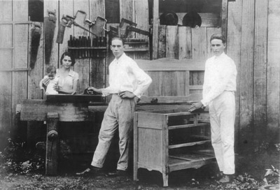 Foto de janeiro de 1930, da Marcenaria Bataclã, na Fazenda 7 Lagoas. (1) e (2) os proprietários Antônio Rodrigues dos Santos (“Antonio Marceneiro”) e a esposa Elza Leite dos Santos, (3) o filho Antônio Rodrigues dos Santos Filho e (4) não identificado.