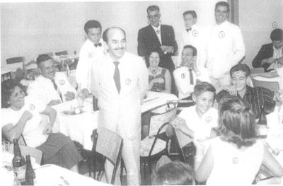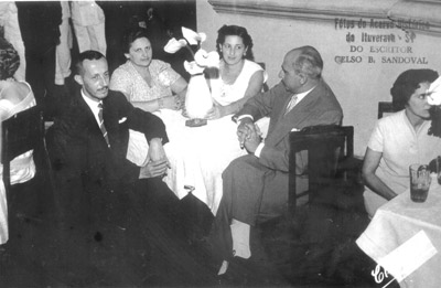 Foto de 6 de novembro de 1963, das Bodas de Ouro do agropecuarista José Sandoval e Custódia Falleiros Sandoval. (1) Judith Maria R. Sandoval, (2) José Rodrigues Sandoval, (3) Paulo Sandoval Moreira, (4) não identificado, (5) Antônio (Totonho) Sandoval, (6) garçom não identificado, (7) João Ferreira Telles, (8) Humberto Lebrão Sandoval, (9) Maria Sandoval Peres, (10) Eduardo Flores Peres, (11) Francisco (Chico Garçom), (12) Walter Gama Terra, (13) Carminha Sandoval Terra
