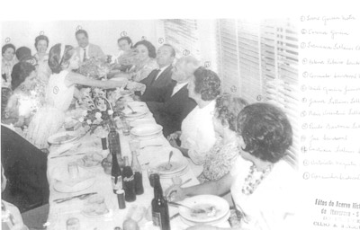 Foto de 6 de novembro de 1963, das Bodas de Ouro do agropecuarista (10) José Sandoval e (11) Custódia Falleiros Sandoval. (1) Ivonte Garcia Mota, (2) Carina Garcia, (3) Francisca Falleiros Almeida, (4) Helena Ribeiro Sandoval, (5) Consuelo Sandoval Moreira, (6) Uriel Garcia Júnior, (7) Joana Falleiros Telles, (8) Nair Vicentini Falleiros, (9) Paulo Barbosa Falleiros, (12) Antonieta Mesquita Garcia, (13) Carminha Sandoval Terra