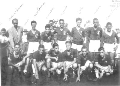 Foto de 1947, do Ituverava Esporte Clube, no campo da Associação Atlética Ituveravense. (1) o técnico Joaquim Cassiano, (2) José Raul Chiconelli,