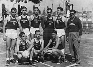 Foto de 1951, Jogos Abertos do Interior. Equipe de basquetebol de Ituverava representada pelos atletas da Associação Atlética Ituveravense (AAI). Em pé, da direita para a esquerda: Jorge Nunes nº 45, Devayl Chiconelli nº 20, Zito Abdallah