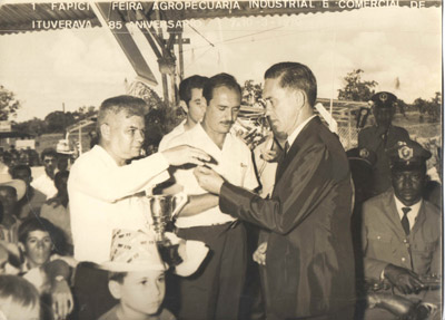 Foto de 10 de março de 1970, quando (1) o professor Manuel Lázaro Pereira, entregava um prêmio ao empresário (2) José Garnica, proprietário dos Móveis Garnica, na Feira Agropecuária, Industrial e Comercial de Ituverava, (3) o prefeito Archibaldo Moreira Coimbra