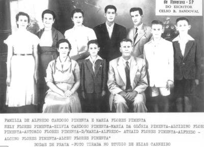 Família de Alfredo Cardoso Pimenta e Maria Flôres Pimenta. Os patriarcas (8) e (6) Alfredo Cardoso Pimenta e Maria Flôres Pimenta, e os filhos: (1) Nely Flôres Pimenta, casada com Hortêncio de Paula, (2) Sílvia Cardoso Pimenta, casada com Silvério Lima Neto, (3) Maria da Glória Pimenta, casada com Washington de Souza Gomes, (4) Alcidino Flôres Pimenta, casado com Maria Terezinha Quatroti Pimenta, (5) Antônio Flôres Pimenta, casado com Oneida Ribeiro Lino Pimenta, (7) Ataíde Flôres Pimenta, casado com Águida Maria Galdiano Pimenta, (9) Alceu Flôres Pimenta, casado com Beatriz Helena Mattar Pimenta, e (10) Alcino Flôres Pimenta, casado com Ana Lúcia Mendonça de Oliveira. A foto foi tirada no Studio de Elias Carneiro