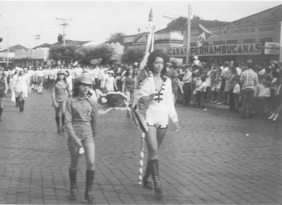 Foto do desfile cívico de 7 de setembro de 1971, Dia da Independência do Brasil, pela avenida Dr. Soares de Oliveira, em frente as Casas Pernambucanas, ao lado do Banco Itaú. (1) Luzia Marlene Vieira Coelho. Ela, que nos anos 70 foi eleita mis Turismo do Estado de São Paulo, é filha de Antônio Carlos Coelho (“Taú”) e Terezinha Vieira Coelho, (2) não identificada