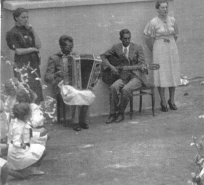 Foto de 1937, em uma apresentação no Grupo Escola Fabiano Alves de Freitas: (1) o sanfoneiro José Monteiro, que era deficiente visual, comandava um conjunto que animava festas, bailes e serenatas na cidade. Ele era tio do fundador da Tribuna de Ituverava, Adhemar Cassiano, (2) Antônio de Carvalho, que era um excelente violonista,