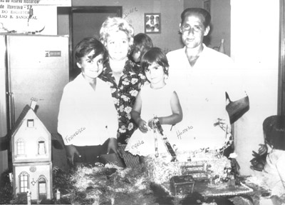 Foto do aniversário de Carla de Castro Liporaci, em 29 de março de 1972, na residência de seus pais Francisco Liporaci Neto e Celma de Castro Liporaci. (1) e (2) Os irmãos Francisco de Carlos Liporaci (“Kiko”) e Carla de Castro Liporaci, (3) e (4) os padrinhos da aniversariante, Homero Andréo Peres e Dirce de Castro Peres
