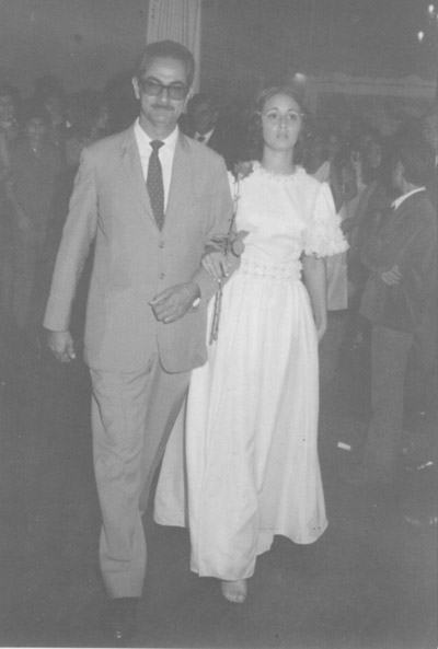 Foto de 1971, da solenidade da conclusão do Curso Ginasial de Denise Eleutério Abdalla Moisés, realizada no salão social da Associação Atlética Ituveravense. Ela é filha de José Abdalla (Zito) e Neuza Eleutério Abdalla. Denise é casada com o médico Omar Moysés, e o casal, que reside em Sertãozinho, tem os filhos Omar Moysés Filho e Taís Abdalla Moysés