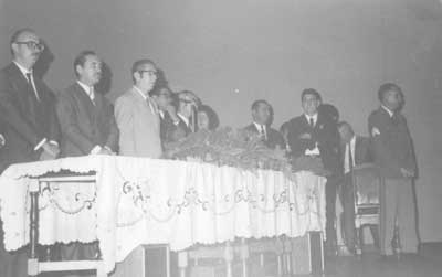 Foto de 1971, da mesa que presidiu os trabalhos da solenidade dos alunos que concluíram do Curso Ginasial do Instituto de Educação Capitão Antônio Justino Faleiros. (1) o Delgado de Ensino José Rodini Luiz, (2) o prefeito Archibaldo Moreira Coimbra, (3) o diretor do Instituto de Educação, Octacílio de Paula Souza,