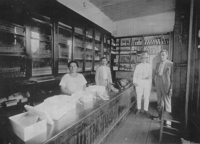 Foto da década de 40, de uma loja de roupas - Loja Flor de Maio, secos e molhados, que era instalada na Avenida Dr. Soares de Oliveira, onde hoje é a CTBC. (1) e (2) os proprietários Antônio José Felício e a esposa dona Sara, (3) e (4) não identificado
