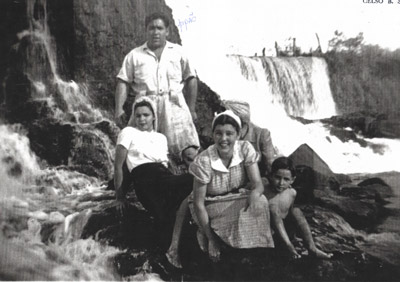Foto de 1947 ou 1948, na Cachoeira Salto Belo. (1) e (2) João Andrade Garcia (“Pipa”) e a esposa Helena Garcia (ambos falecidos), (3) Maria Amélia Chereguini, viúva de José Chereguini, (4) e (5) Rosa Conceição Oliveira, viúva de Sebastião Ari de Oliveira, e o filho Luiz Carlos de Oliveira (in memoriam)