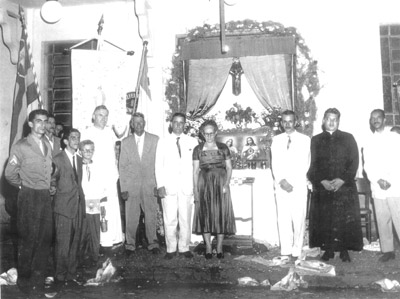 Foto de uma comemoração religiosa na prefeitura de Ituverava, na administração de João Athayde de Souza, de 1956/1959. (1) e (2) o prefeito João Athayde de Souza e a primeira-dama Julieta Valize de Souza, (3) o comandante do TG 0226 de Ituverava, o então sargento Washington de Souza Gomes, hoje capitão da reserva (4) e (5) não identificados, (6) e (7) os padres Dario de Romenedie Osório Araújo de Lima, (8) (9) e (10) os vereadores Alfredo Cardoso Pimenta, José Antônio Salgado e Adhemar Cassiano