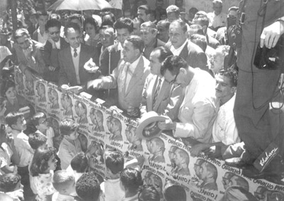 Foto de 1958, de um comício dos candidatos a presidente da República, Jânio Quadros, e ao governo de São Paulo, Carvalho Pinto. Jânio foi eleito presidente da República em 3 de outubro de 1960, pela coligação PTN-PDC-UDN-PR-PL, para o mandato de 1961 a 1965, com 5,6 milhões de votos - vencendo o marechal Henrique Lott. A gestão de Jânio Quadros na presidência da República durou sete meses e encerrou-se com a renúncia. Carvalho Pinto foi eleito em 1958, com um total de 1.312.017 votos (51% dos votos válidos), derrotando as candidaturas de Ademar de Barros (PSP) e Auro Soares de Moura Andrade (PST). (1) Jânio da Silva Quadros, (2) o candidato a governador, Carvalho Pinto,