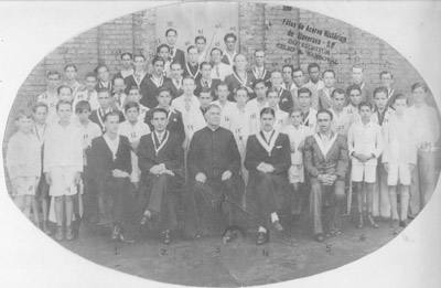 Foto da década de 30, em frente da Igreja Matriz Nossa Senhora do Carmo, quando ainda estava em fase de acabamento. Na primeira fila, membros da Congregação Mariana. (1) o Padre João Rulli, que construiu a igreja, (2) Nagib Salti Jammal (3) não identificado, (4) Irmão do Padre Alceu, (5) Amâncio Fragas Vidal. Outros nomes: Paulinho “Cartorário”, Sabiá, Núncio Bordam, Vitório Retivo, Arlindo Bordom, Geraldo Ferrari, Jayme Sofia, Alcci Barbosa, Antônio Salvino, Jorge Elias, Alberto Simões