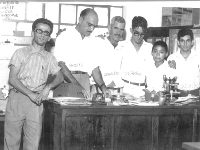Foto da decada de 60, no escritório da Algodoeira Nakano, em Guará. (1) Renée Ferreira Telles, (2) Messias Barbosa de Freitas, (3) Arnaldo Ferreira Telles, (4) Airton Álvaro dos Santos, (5) Midiminha, e (6) Osair Pereira de Souza (“Neguin”)