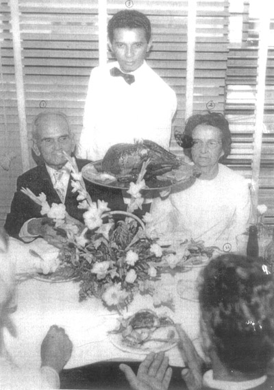 Foto de 6 de novembro de 1963, da festa de Bodas de Ouro, que foi realizada no Caiçara Hotel, do (1) e (2) agropecuarista José Sandoval e Custódia Falleiros Sandoval, que eram servidos por (3) Francisco Carlos da Silva (“Chico Garçom”). Sãos filhos do casal: José Barbosa Sandoval Filho, casado com Leny Lebrão Sandoval; Antônio (“Totonho”) Sandoval, casado com Helena Ribeiro Sandoval; Irlandino Neto Sandoval, casado com Elza Rodrigues Sandoval; Maria das Dores Barbosa Sandoval Perez (“Dona Mariinha”), casada como Eduardo Perez; Maria do Carmo Faleiros Sandoval (“Dona Carminha”), casada com Walter Gama Terra; Maria de Lourdes Sandoval Moreira, casada como Ataíde Sandoval Moreira; Maria Jacyntha Sandoval Garcia, casada com Alcides Mesquita Garcia; e Fausto Hernani Sandoval, casada com Altina Rodrigues Sandoval