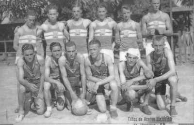 Quadro de Bola ao Cesto, do Centro de Cultura Física de Ituverava de 1935. De pé esportistas de Uberlândia. Ajoelhados os ituveravenses: (1) Maciel, (2) José Ferreira Telles (Dr. Juquinha), (3) José Soares de Oliveira (“Zé Galo”), (4) Núncio Bordom, (5) Cecim Miguel e (6) Moacir França