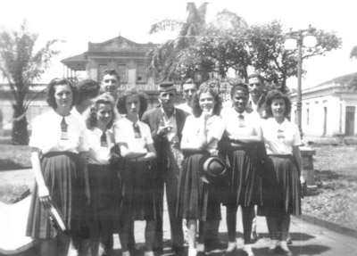 Foto dos anos 40, na Praça 10 de Março, de amigos e alunas do Ginásio Municipal: (1) não identificada, (2) Talles Trigo, (3) Túlio Del Guerra, (4) Mariano Giffone, (5) José Mauad, (6) Vanda Amorim, (7) Edna Borba, (8) Lourdes Coimbra, (9) Tereza Lopes, e (10) Luzia de Paula Leão