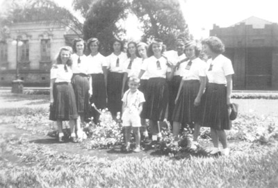 Foto de frente a residência do dr. Gaetano, na Praça 10de Março, dos anos 40. (1) Wanda Amorim, (2) não identificada, (3) Lucí Babosa Lima, (4) Jaci Falleiros, (5) Madalena Barbosa, (6) Edna Borba, (7) Lourdes Coimbra, (8) Thereza Lopes, (9) Thereza de Luca, (10) Luzia Leão, (11) o menino não identificado