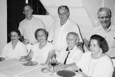 Foto tirada no reveillon de 1995 na Fazenda Sobrado, dos sete irmãos, filhos do Capitão Joaquim Ribeiro da Rocha e Regina Ribeiro dos Santos. (1) Edson Ribeiro da Rocha, casado com Edna Francelin Ribeiro da Rocha; (2) Eurípedes Ribeiro (“Pino”), casado com Maria de Lourdes Henrique Ribeiro; (3) Jesus Ribeiro da Rocha (in memoriam), casado com Anália de Paula Rocha; (4) Helena Ribeiro Sandoval, casada com Antônio Sandoval (falecidos); (5) Maria de Lourdes Ribeiro Cordaro, casada com Salvador Cordaro Cruz (falecidos); (6) Isabel Ribeiro Fonseca, casada com José Alípio Furquim Fonseca (falecidos), e (7) Eunice Ribeiro da Rocha
