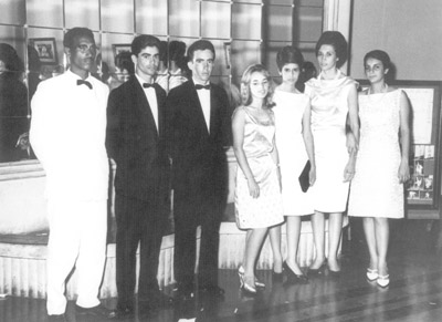 Foto tirada no salão da Associação Atlética Ituveravense, da festa de formatura da turma de 1963, da Escola Técnica do Comércio Ituverava, realizada na Associação Atlética Ituveravense. (1) Marcos Ferreira Neto, (2) Antonio Ferreira de Matos, (3) Ulisses Ribeiro dos Santos Jr., (4) Dalva Pitta Dias, (5) Maria Luiza Dantas Bernardes, (6) Maria Antonieta Dias Ribeiro dos Santos, (7) Nadir Galdiano Vasco
