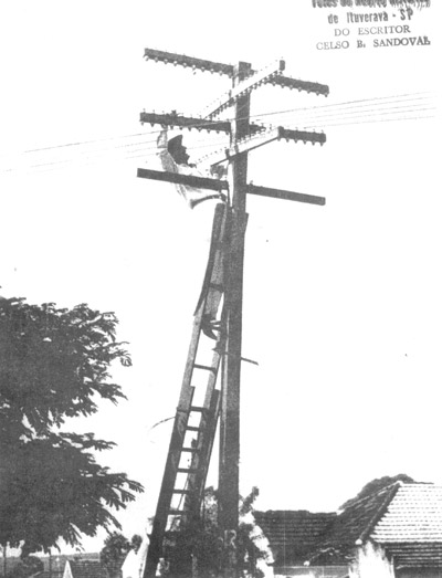 Foto de 1959, quando o proprietário da Serviço Telefônico de Ituverava, empresa da cidade, Newton Freire de Alvarenga Viana, fazia reparos da rede
