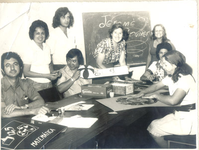 No ano de 1975, professores do Instituto de Educação “Capitão Antônio Justino Falleiros” trabalhavam em um projeto educacional. (1) Paulo Ernesto Nave, (2) Atair Ignácio, (3) não identificado,(4)Mauro Takahashi, (5) Ada Vanucci Coimbra, (6) Guilhermina Tetralda de Lima Coimbra, (7) Apparecida Abdala , (8) ZIlda Ribeiro Gomes