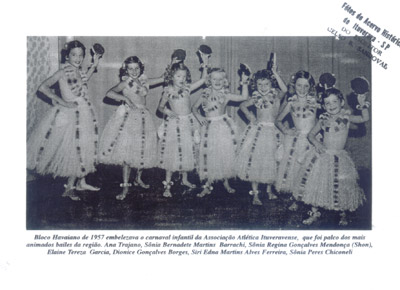 Em 1957, foto do Bloco Havaiano, na matinê de carnaval da Associação Atlética Ituveravense. (1) Ana Maria Borges,