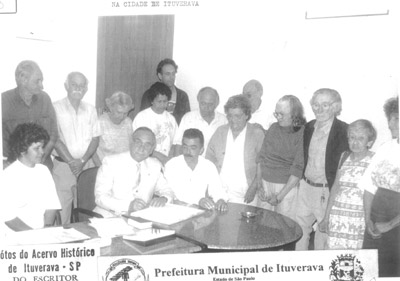 Foto de 1995, quando o prefeito Archibaldo Moreira Coimbra e o vice-prefeito e secretário de Obras, Antonino Carlos Vieira de Matos assinavam a escritura da aquisição do terreno de propriedade da família Galindo, onde foi construída a Creche Maria Galindo, no bairro Bicão; (1) o prefeito Archibaldo Moreira Coimbra, (2) o vice-prefeito e secretário de Obras, Antonino Carlos Vieira de Matos, (3) e (4) Francisco Galindo e Neusa Cheruti Galindo, (5) Astrogildo Galindo, (6) Aparecida Pereira Galindo, (7) Neusa, (8) Hiram Galindo José, (9) Magno Galindo, (10) Athaulfo Galindo, (11) Dinah Avelar Galindo, (12) Romula Galindo Matheus, (13) Miguel Matheus, (14) Dorotéia Galindo e (15) Maria Palino dos Santos