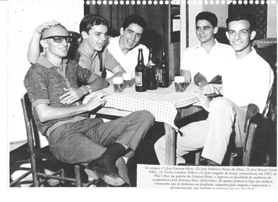 Foto de 1965, no Pile’c Bar, que funcionava no fundo da galeria do Caiçara Hotel (hoje Domus Hotel), os amigos, que hoje são todos médicos. (1) José Estavam Alves que havia sido aprovado no vestibular de Medicina, (2) Luiz Falleiros Nunes da Silva, (3) e (4) os irmãos José Dirceu Cardoso Telles e Carlos Cardoso Telles, (5) João Augusto de Souza, advogado