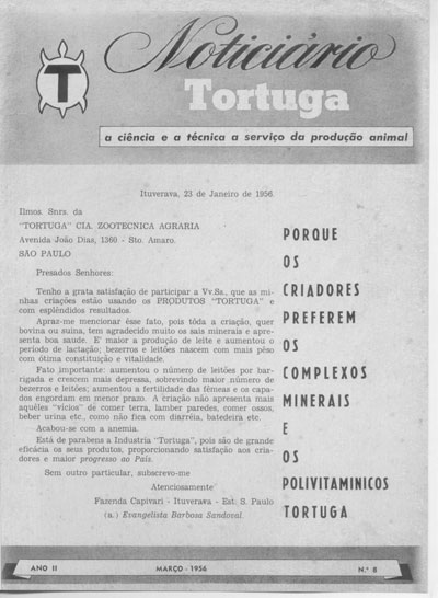 Em março de 1956, a carta do fazendeiro Evangelista Barbosa Lima, proprietário da Fazenda Capivari, era reproduzida na revista Noticiário Tortuga, editada pela empresa Tortuga Cia. de Zootecnia Agraria. Ela elogiava os produtos da empresa