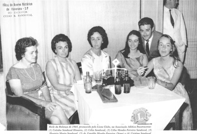 Foto dos anos 60, de um Baile da Balança que era promovido pelo Lions Clube de Ituverava, na Associação Atlética Ituveravense: (1) e (2) as irmãs Cotinha Sandoval Henares, que era casada com o advogado Halley Henares e Célia Sandoval, (3), (4), (5) e (6) Célia Mendes Ferreira Sandoval e as filhas Honória Maria Mendes Sandoval e Cristina Mendes Sandoval, e o irmão Geraldo Mendes Ferreira (”Nena”)