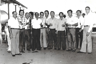 Foto de 1971, da inauguração de um embarcadouro de cereais da Coagre, cujos proprietários da empresa eram Eurípedes Ribeiro (“Pino”) e Antônio Rodrigues Bertelli. (1) Salvador Cordaro Cruz, (2) Fernando Cordaro, (3) Isao Morya, (4) José Carlos Miranda, (5) Eurípedes Ribeiro (“Pino”), (6) Antônio Rodrigues Bertelli, (7) José Manoel Mendonça de Oliveira, (8) Aramis Lázaro Marquesi, gerente do Banco do Brasil, (9) Paulo Jacob Ferreira, gerente do Banco Itaú, (10) não identificado, (11) Ideo Morya e (12) José Cangussu, gerente do Banco Itaú