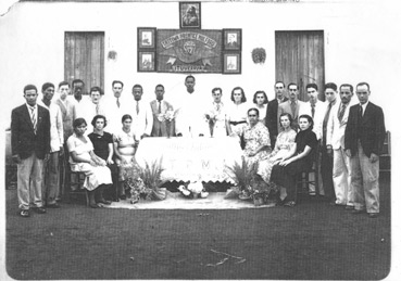 Foto dos anos 30, de uma reunião dos membros da Congregação dos Estudiosos do Centro de Ezotorismo – Tattiwa Prentice Muilford. O centro, que era presidido por (1) Bendito Quintino Pereira, pregava o bem-viver, saúde, paz, amor e felicidade, além de promover a assistência social