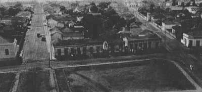 Foto da cidade de 1935, que foi tirada de cima da Igreja Matriz Nossa Senhora do Carmo. (1) na Rua Cel. José Nunes de Silvam, onde a esquerda é uma residência e direita (2) o Escritório de Contabilidade Veneza. (3) a Rua Capitão Ribeiro dos Santos, onde a esquerda hoje é um sobrado que é uma residência, (2) neste local foi por muitos a Agência dos Correios e hoje está instalada Casa Santo Antônio, em frente ao CNA. Mais ao fundo também pode se ver a Praça Jorge Tibiriçá, hoje 10 de Março, mas sem a caixa d’água, que ainda não existia