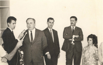 Foto do ano de 1966, de uma solenidade realizada na cidade. (1) e (2) o prefeito Orlando Seixas Rego e sua esposa Zélia Nunes da Silva Rego, (3) o vice-presidente da Câmara, José Alípio Furquim Fonseca, (4) não identificado, (5) repórter da Rádio Cultura de Ituverava.