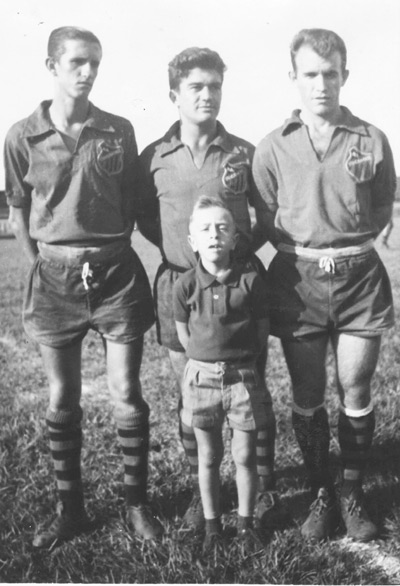 Foto dos anos 60, de craques de Ituverava, que jogavam pela Associação Atlética Ituveravense. (1) José Roberto de Paula (“Carioca”), (2) Celso Nunes (“Piolim”), (3) Antônio Carlos Ferreira (“Guru”) e (4) e o mascote Raul de Paula Perez (“Rauzinho”)