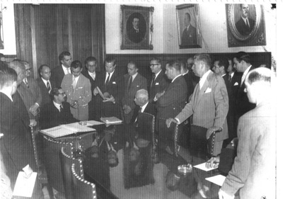 Foto do de Jânio da Silva Quadros despachando no Palácio dos Bandeirantes, quando foi governador de São Paulo de 1955 a 1958. (1) o governador Jânio Quadros, (2) José Vicente de Faria Lima, que era secretária de Viação e Obras Públicas. Ele foi prefeito de São Paulo de 1965 a 1968, e considero um dos melhores de sua época, (3) Carlos Alberto Alves de Carvalho Pinto, que era secretário da Fazenda, e foi governador do Estado de 1959 a 1963, (4) e o prefeito João Athayde de Souza, que administrou a cidade de 1956b a 1959 e 1948 a 1951
