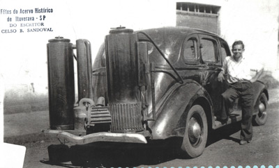Foto de 1941, devido a crise do petróleo, os irmão Toninho e Amadeu Caligher (na foto), fabricavam aparelhos de gasogênio, que eram abastecidos com gás natural veicular (GNV), acondicionando-os em automóveis, caminhões e jardineiras.