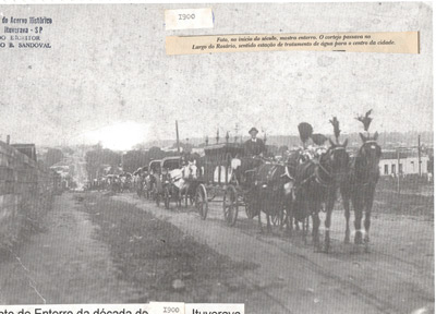 Foto da década de 1900, que mostra um cortejo que passava pelo Largo do Rosário, sentido Estação de Tratamento de Água para o Cemitério