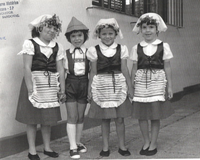 Foto de 1977, quando estudantes participavam de desfile das comemorações do dia 10 de março, data da emancipação política de Ituverava. (1) Simone Machetti Jabur, (2) José Guilherme Peixoto Salgado, (3) Adriana Cristina de Castro e (4) Simone Cavalcanti Macedo
