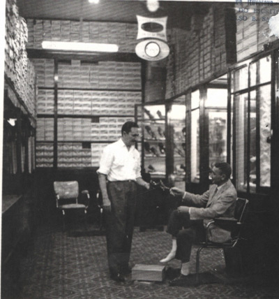 Foto dos anos 60, da Triunfal Calçados, loja que era instalada onde é hoje a Relojoaria Brasil, quando o proprietário, Santinho Barrachi, atendia o advogado José Mendes Teles (“Juju”)
